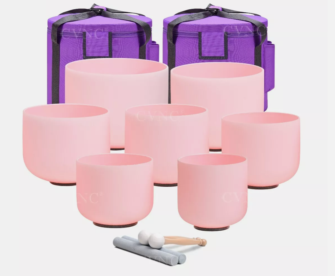 This 432Hz Pink Rose Quartz Crystal Chakra Singing Bowl with Protective Cases Set is a harmonious addition to your sound healing practice. Designed for deep vibrational resonance, each bowl in the set ranges from 6" to 12" in size, creating a balanced soundscape to align and heal your chakras. The soothing tones produced at 432Hz are believed to promote relaxation, emotional clarity, and a sense of inner peace.