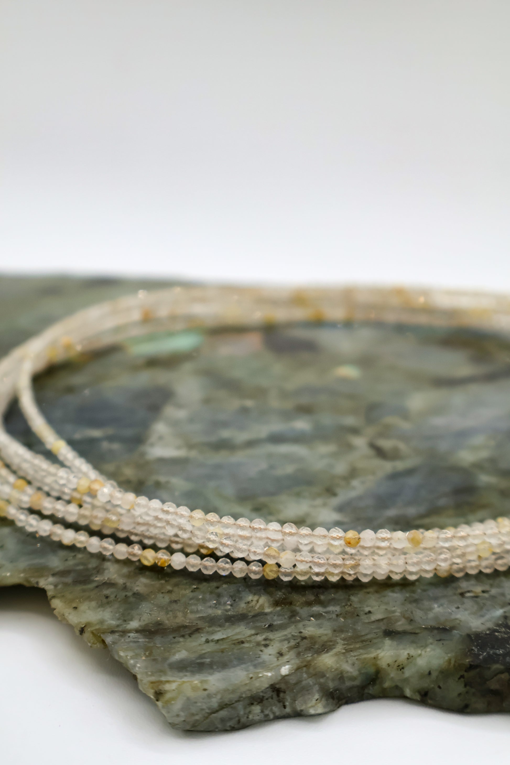 This Gold Rutilated Quartz Crystal Necklace showcases 2mm beads with shimmering golden threads that captivate the eye. Gold Rutilated Quartz is cherished for its energizing properties, believed to amplify intentions, boost positivity, and inspire creativity. Wear this necklace as a symbol of clarity and motivation, bringing a radiant glow to your day.