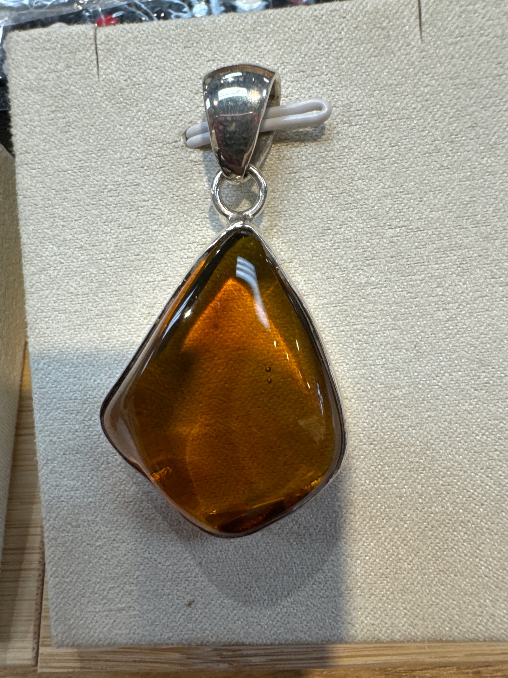Amber is known for its grounding and healing properties, helping to clear negative energy and promote emotional balance. It is often used to enhance vitality and encourage a positive outlook, making this pendant a powerful tool for those seeking emotional clarity and energetic renewal.