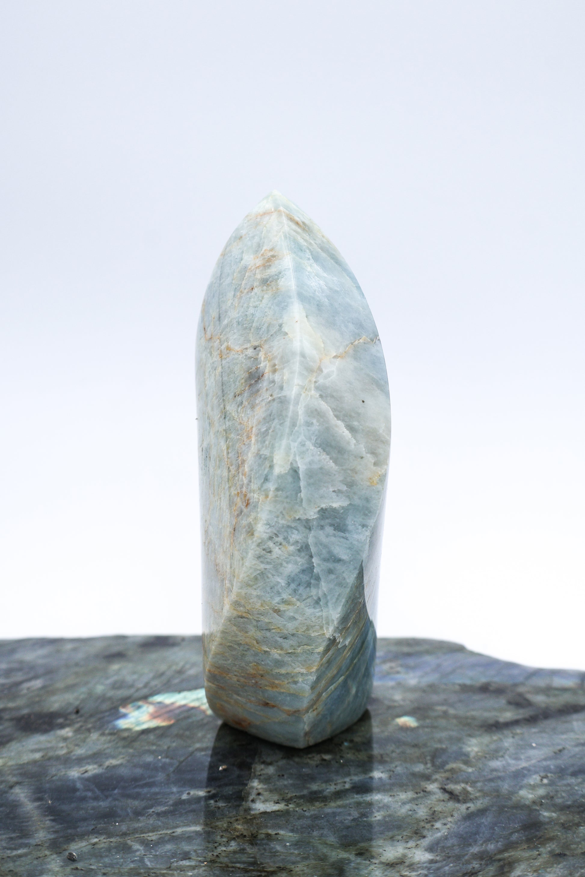 The aquamarine flame crystal display piece is a stunning representation of tranquility and fluidity, with its soothing blue-green hues reminiscent of calm ocean waters. Carved into a flowing flame shape, this piece symbolizes transformation, renewal, and the power of emotional healing. Aquamarine, known as the “stone of courage,” is believed to enhance clarity, communication, and inner peace, making it ideal for meditation spaces or as an energy focal point in your home.