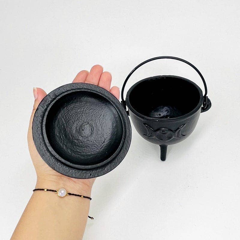 Triple moon accent cauldron with a lid and handle! These little beauties are made out of metal and come in a black finish. Great for offerings, burning incense, and placing on your altar as decor. Also fun to use for Halloween Decor.